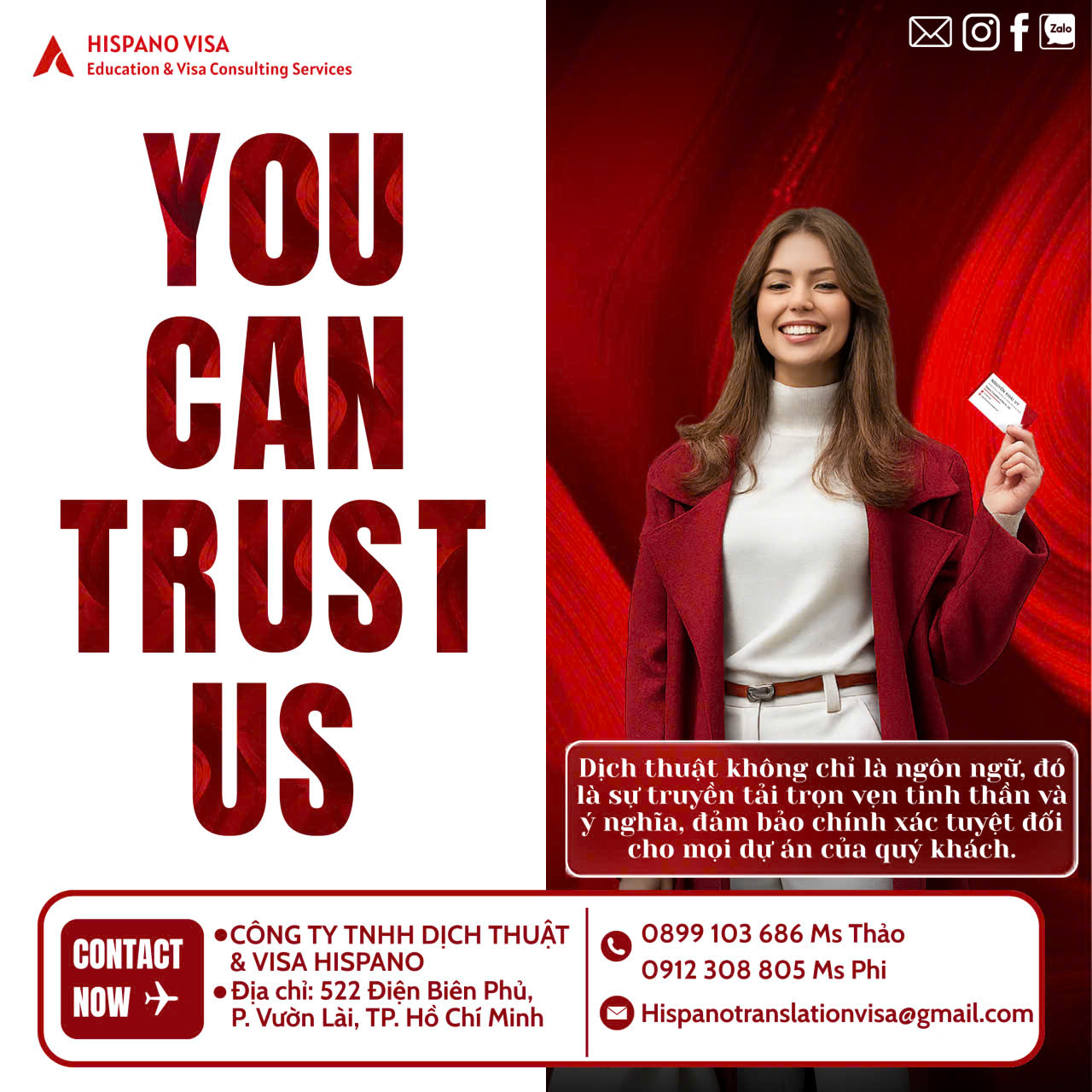 HISPANO TRANSLATION & VISA – đơn vị có hơn 7 năm kinh nghiệm trong dịch vụ ngôn ngữ và pháp lý quốc tế – tự hào mang đến giải pháp dịch thuật công chứng nhanh – chính xác – chuẩn pháp lý – được công nhận trong và ngoài nước.